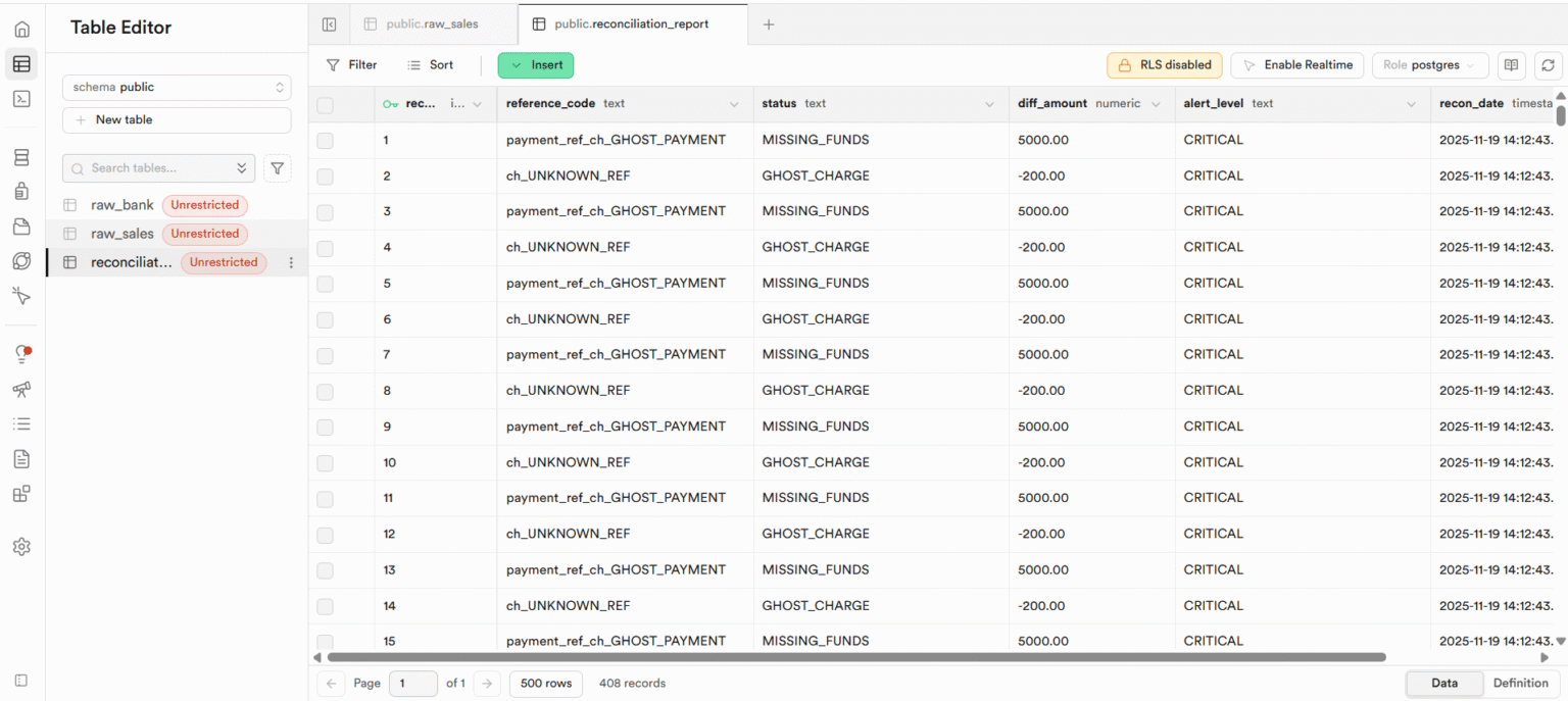 Conciliación bancaria sin intervención humana. Nuestra arquitectura ELT cruza tu ERP contra tu Banco (Stripe, MercadoPago) en segundos usando SQL.